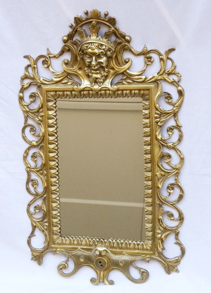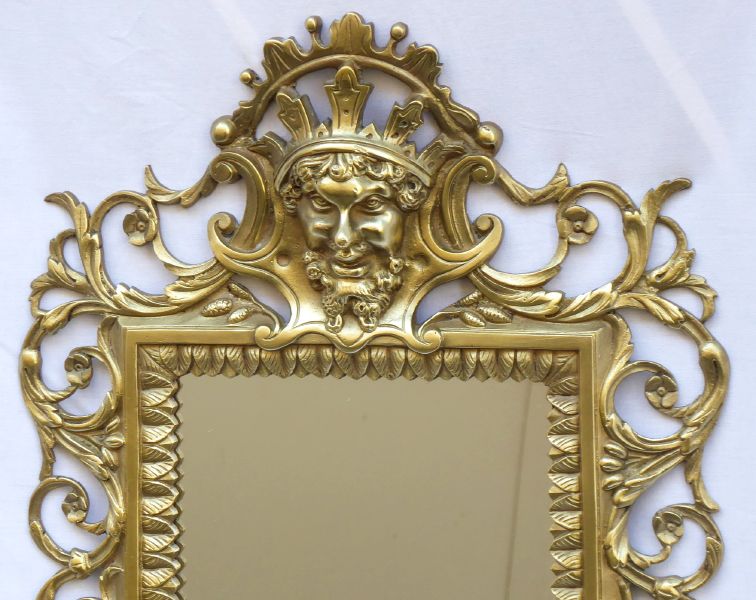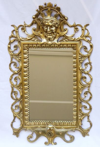 Střední Evropa 1880 - 1910. Bronz nebo mosaz, sklo. V historizujícím stylu. Výška 53 cm a šířka 32,5 cm. Reprezentativní zrcadlo na vrcholu s maskaronem krále v kartuši. Po obvodu s ornamentem rozviliny. V dolní části zakončené kartuší. Vnitřní orámování zrcadla s reliéfním ornamentem palmety.