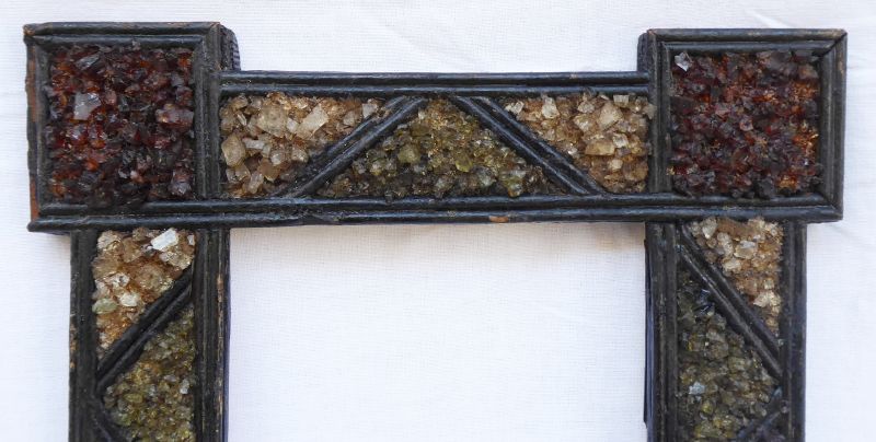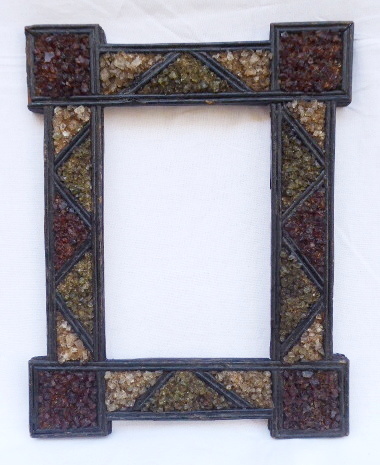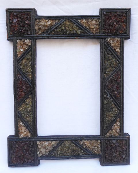 VYKLÁDANÝ SKLENĚNÝMI KAMÍNKY, Střední Evropa 1880 - 1900. Černě lakované dřevo, různobarevné skleněné kamínky připomínající minerály. Světlost 17 cm x 11,5 cm, celkový rozměr 23 cm x 17,5 cm. Neobvyklý dřevěný rámeček vykládaný skleněnými kamínky podobnými barevností i strukturou různým odrůdám minerálů.