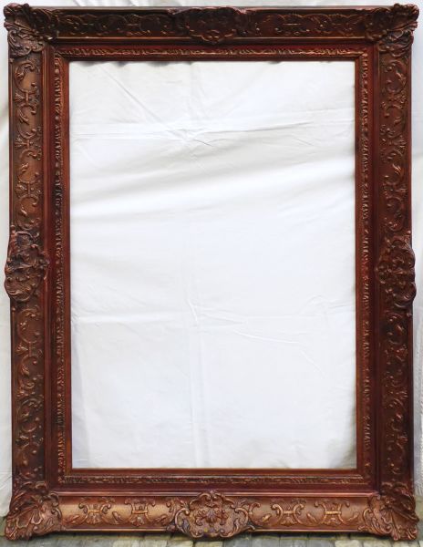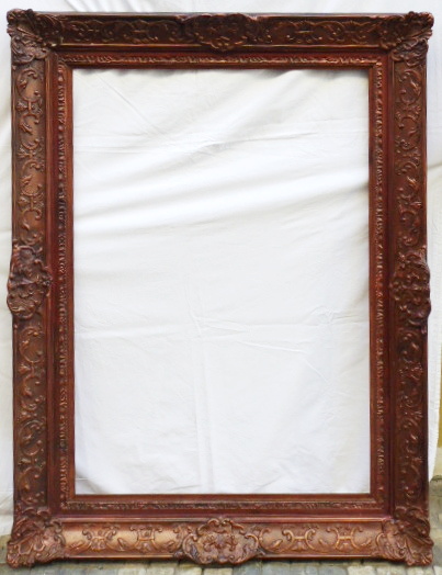 Československo, 40. léta minulého století. Dřevo s kovově bordó patinou. Světlost 66 cm x 97 cm, celkový rozměr 92 cm x 122 cm. Velký galerijní rám bohatě zdobený reliéfními ornamenty. Rám s plochou vnitřní lištou a originálními papírovými štítky. Tento rám byl určený na výstavu Biennale Internazionale d´Art di Venezia v roce 1948.