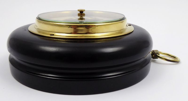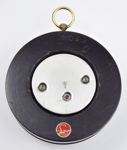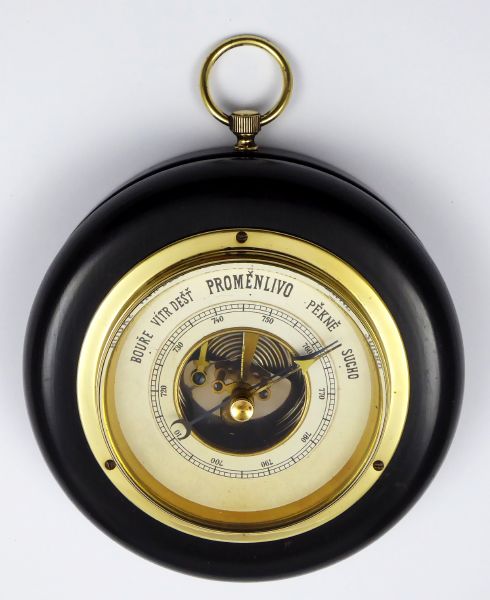 S ČESKÝMI NÁPISY - G. LUFFT, STUTTGART, Německo, Stuttgart 1920 - 1940. Dřevo, mosaz, mechanika. Výrobce: Mechanische Werkstatt G. Lufft. Firma, kterou v roce 1881 založil Gotthilf Lufft v německém Stuttgartu se specializací na aneroidní barometry (mechanické přístroje k měření atmosferického tlaku bez použití kapaliny, které fungují na principu deformace pružné vzduchoprázdné kovové krabičky, která se smršťuje při vyšším tlaku a roztahuje při nižším). Průměr bez závěsného oka: 13 cm. Pokojový aneroidní barometr v černě lakované dřevěné schránce s číselnou stupnicí a českými nápisy: BOUŘE, VÍTR, DÉŠŤ, PROMĚNLIVO, PĚKNĚ, SUCHO. Značeno vzadu: originální papírový štítek s firemním logem a uprostřed se značkou výrobce. Úchyt na závěs.