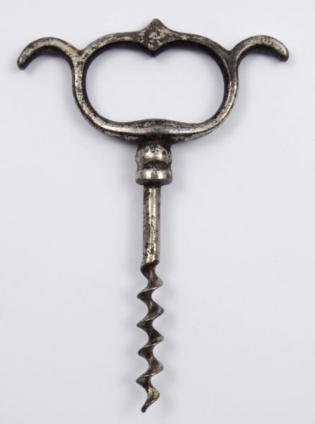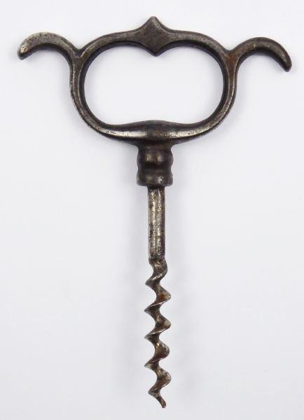 Evropa 1880 - 1920. Ocel. Výška 12 cm, šířka držadla 8,5 cm. Poctivě bytelná starožitná vývrtka klasického tvaru z oceli s obloukovitými úchyty na prsty.
