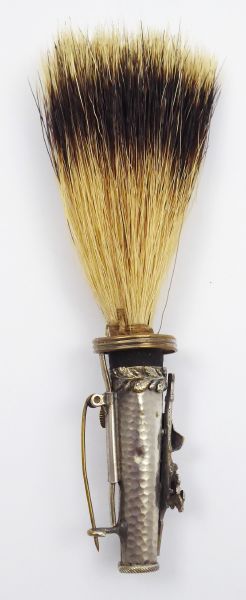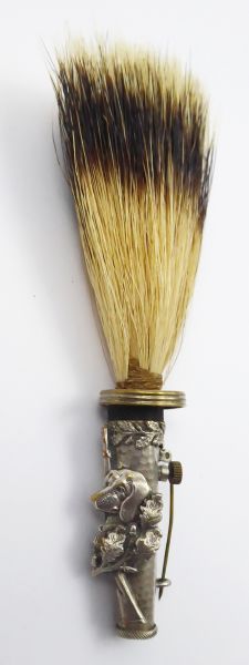 - GAMSBART SE STŘÍBŘENOU FIGURÁLNÍ MOSAZÍ Střední Evropa 1890 - 1920. Pravé štětiny z jezevce, stříbřená mosaz. Celková délka 12 cm. Ozdoba klobouku z pravých štětin z jezevce zasazených do dekorativního pouzdra ze stříbřené mosazi pro uchycení na klobouk. Pouzdro zdobí reliéfní hlava loveckého psa, puška a dubové ratolesti. Velmi zajímavý sběratelský i dekorativní kousek.